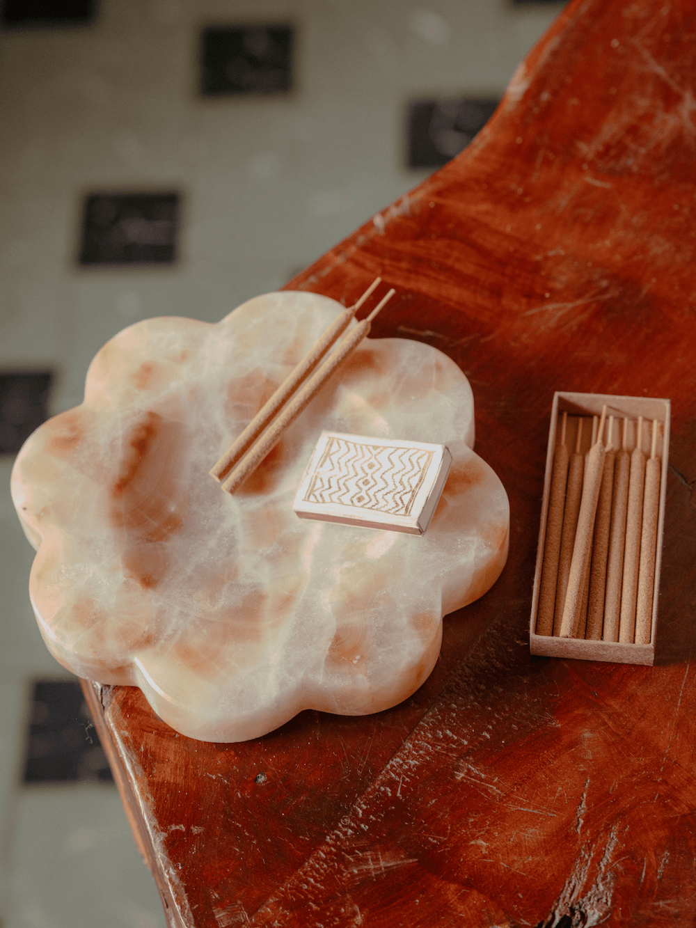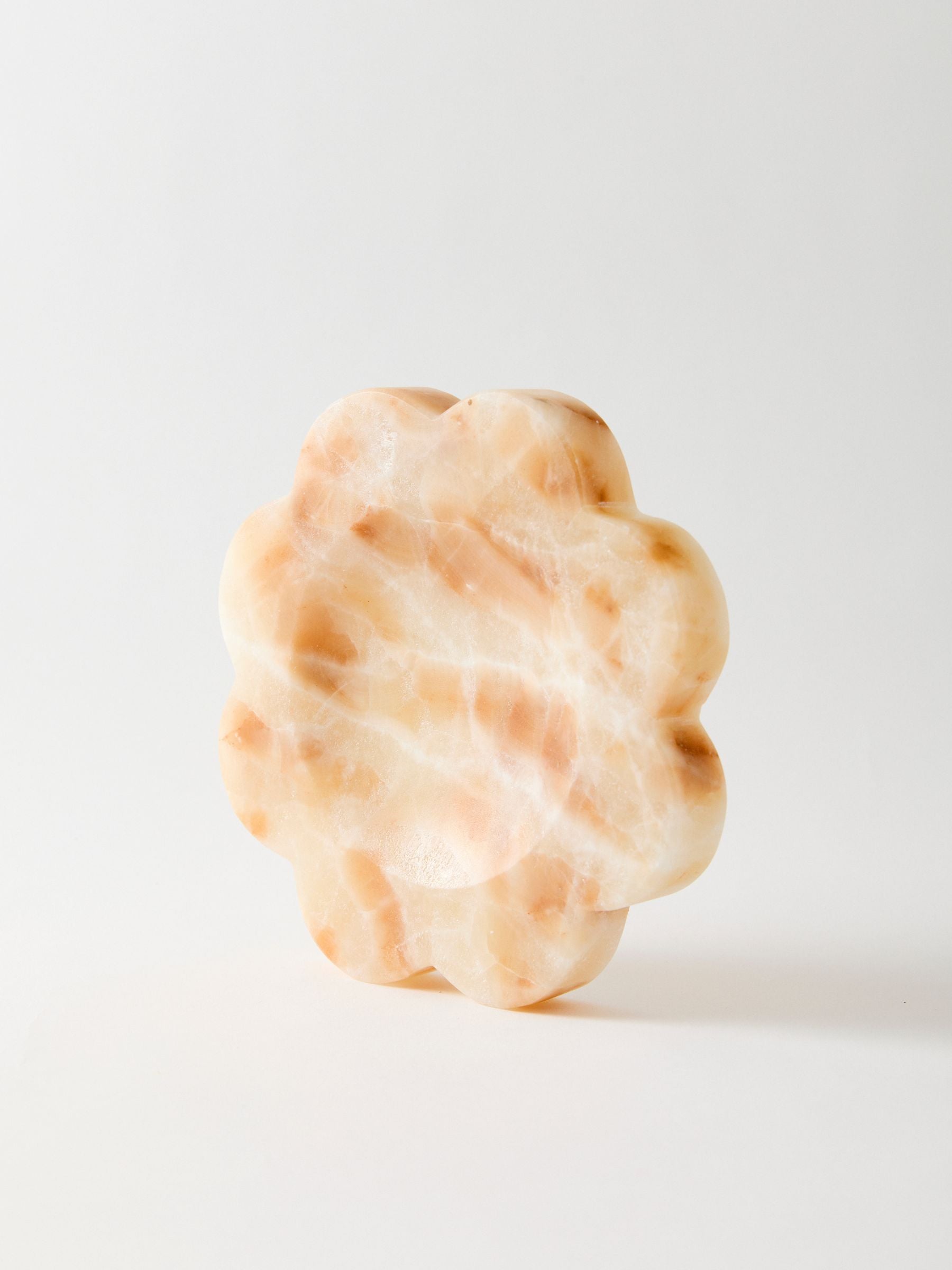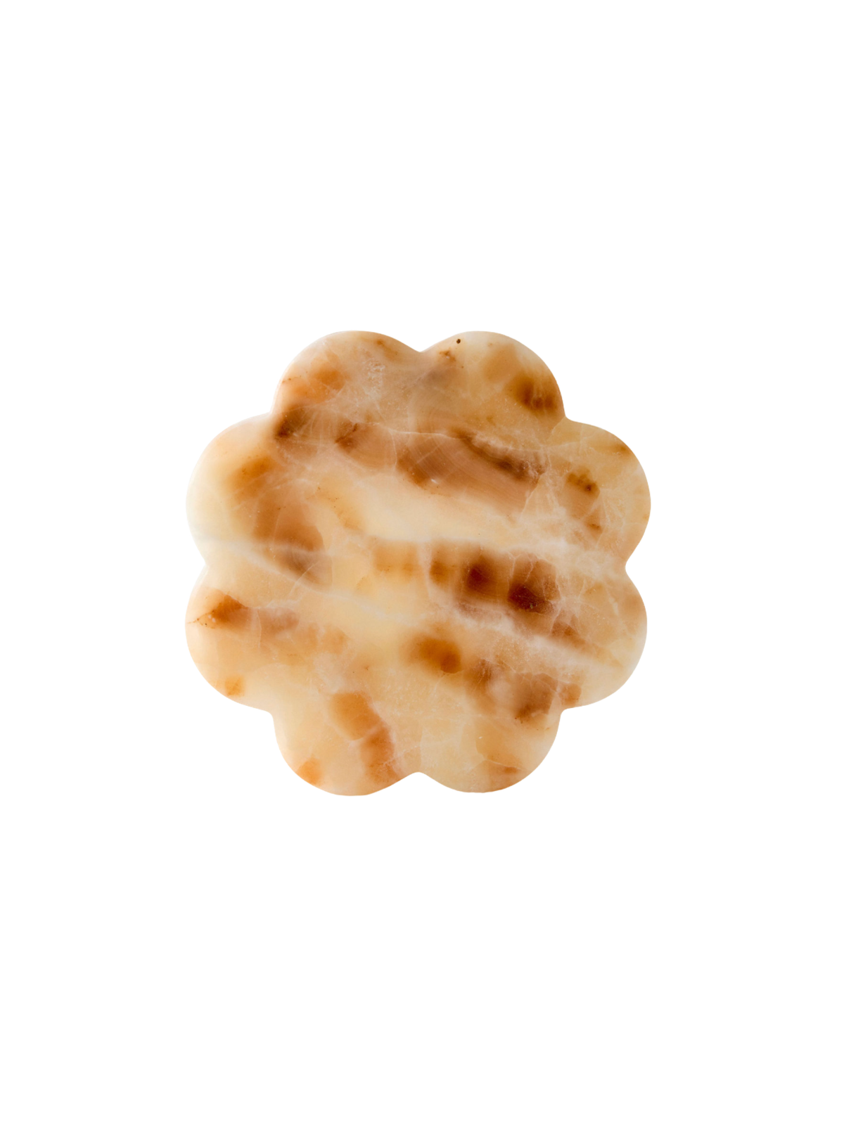This tray is carved from richly veined brown onyx and finished by hand. The scalloped edge lends it a soft, rhythmic quality—ideal for use as a catch-all, incense holder, or decorative accent.
