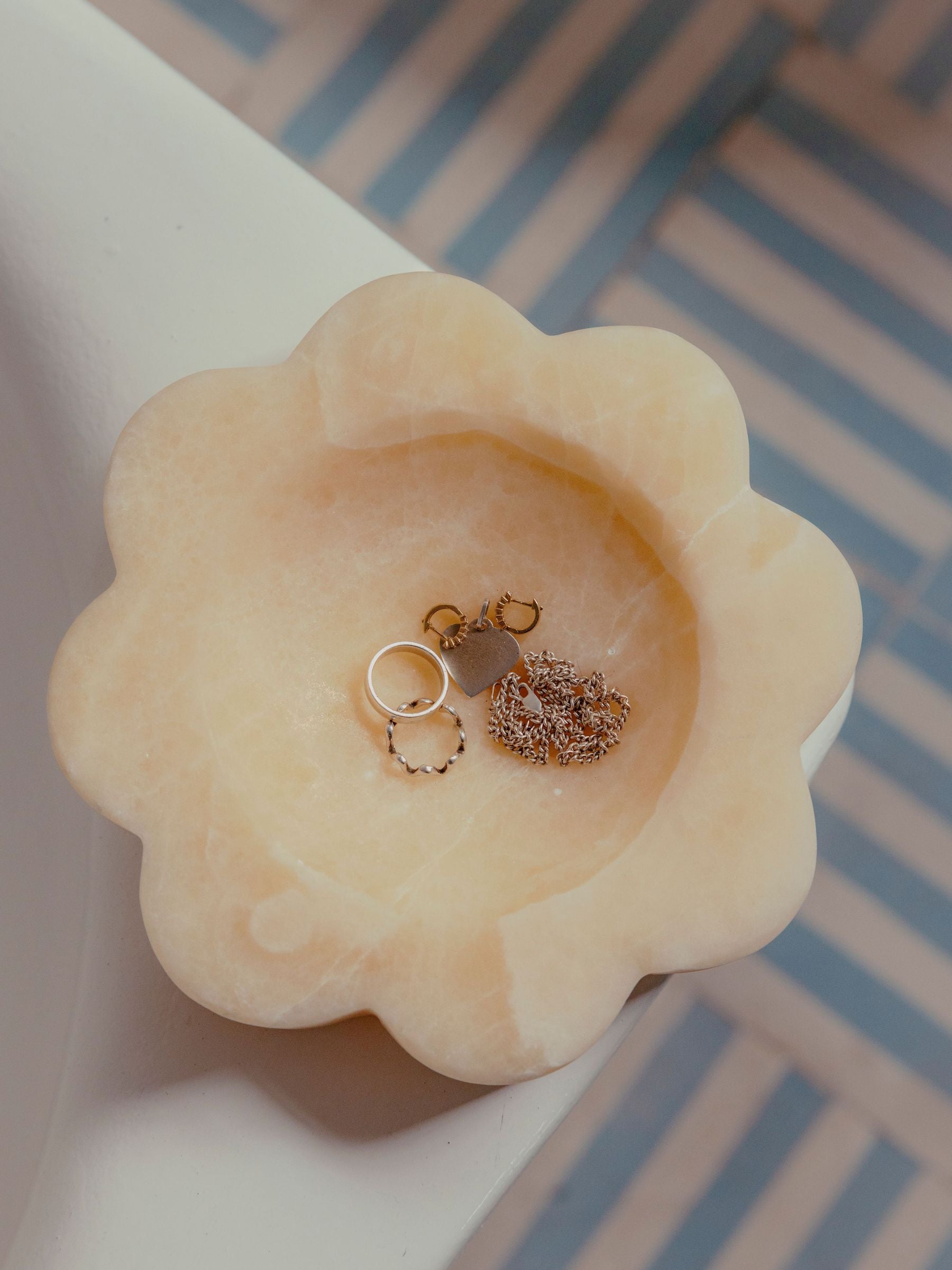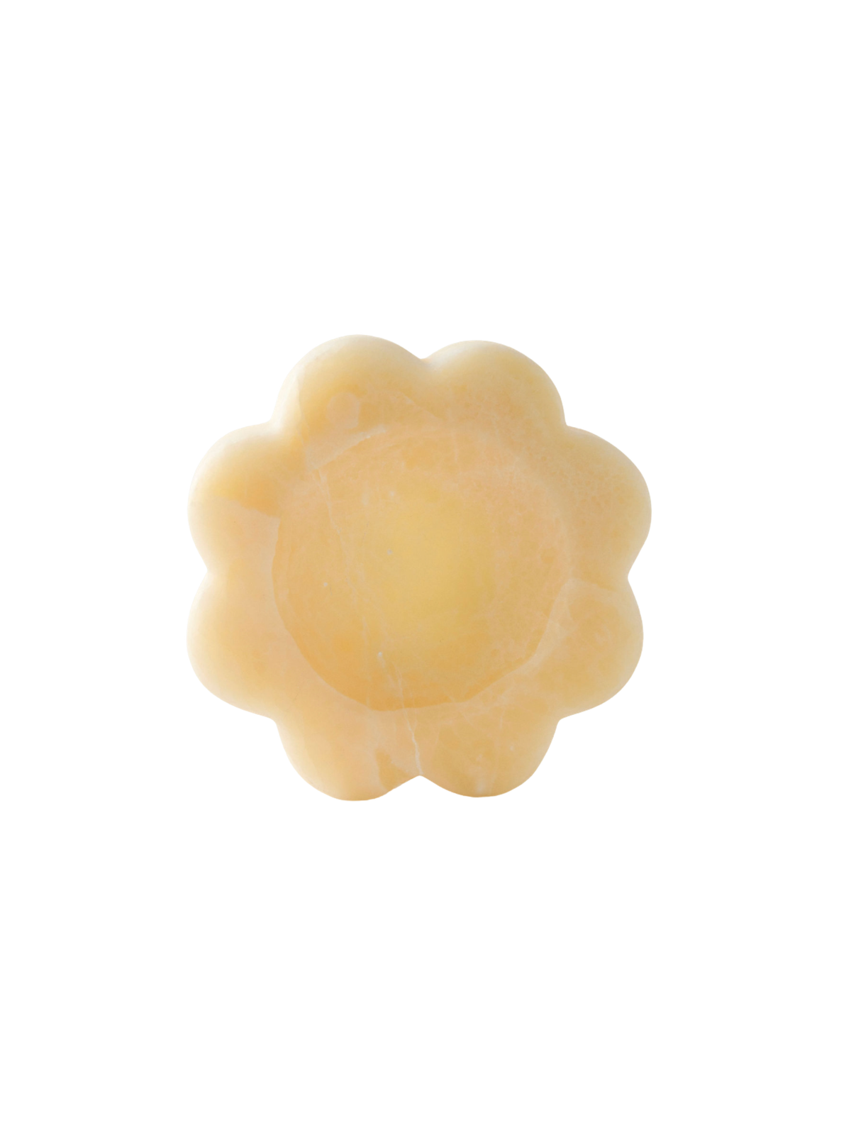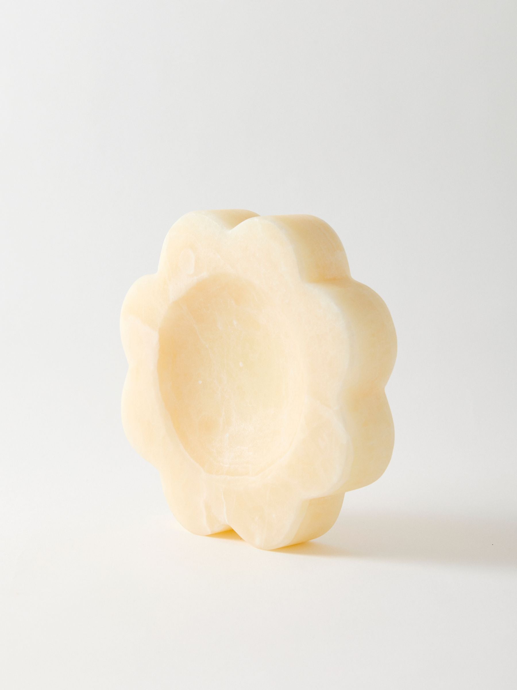 Carved from a single piece of white onyx, the Dalia Tray features scalloped edges and a smooth, hand-finished surface, ideal as a catch-all for jewelry, keys, or as a decorative object on its own.