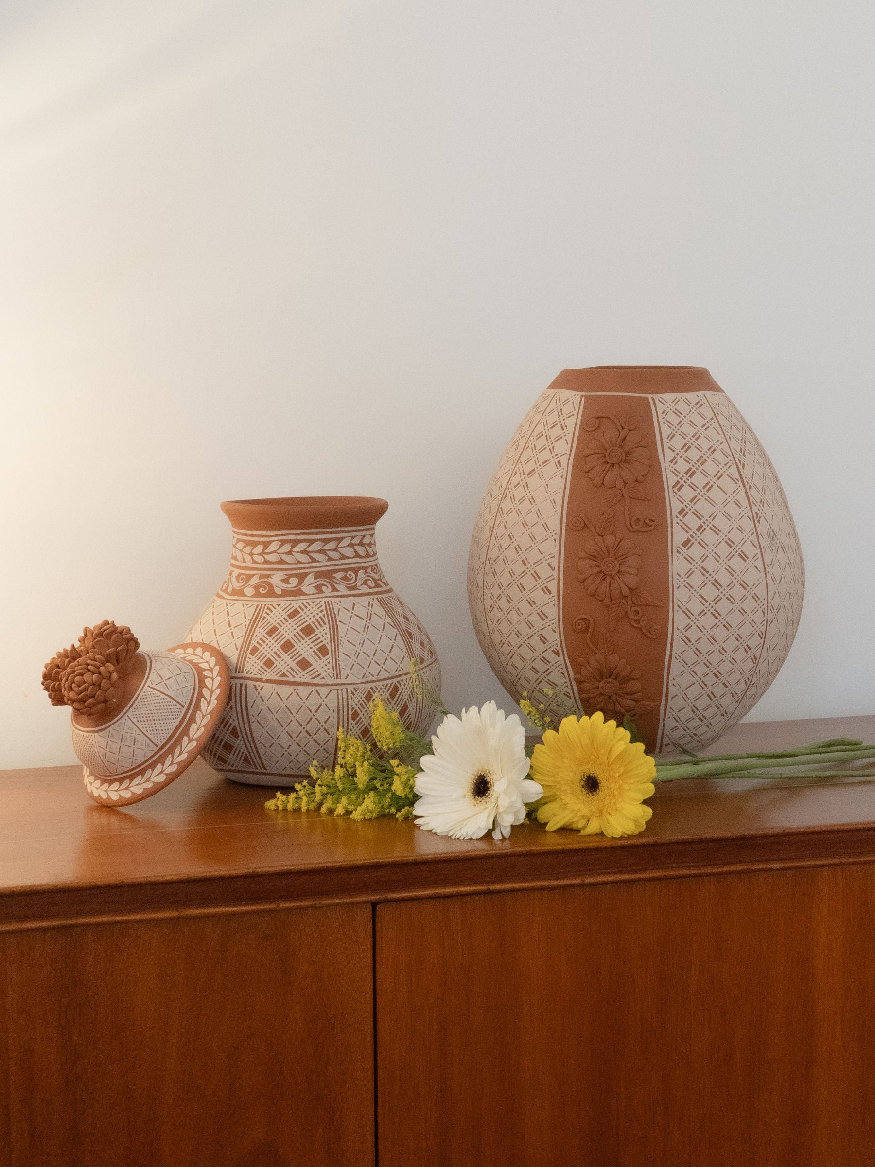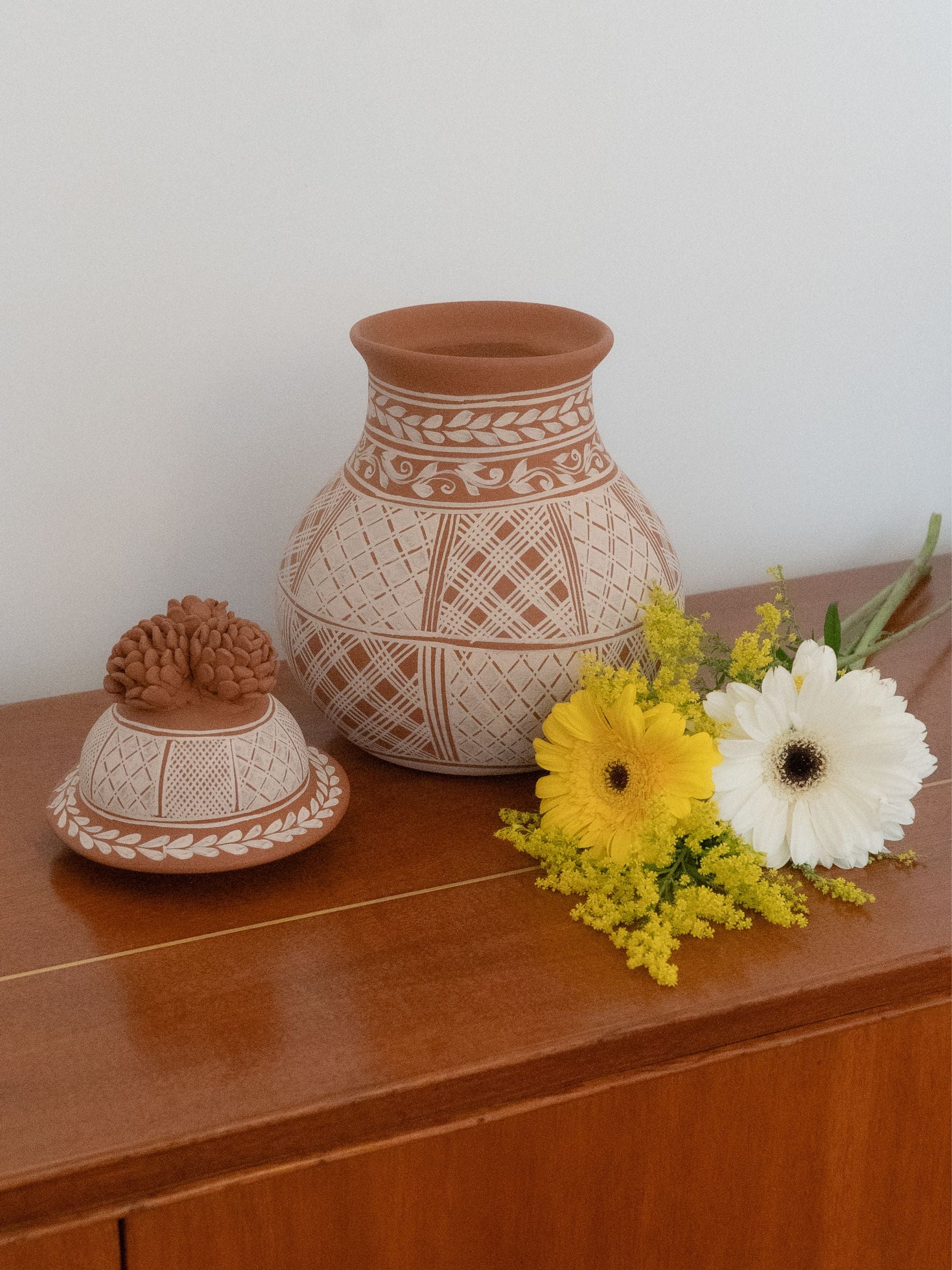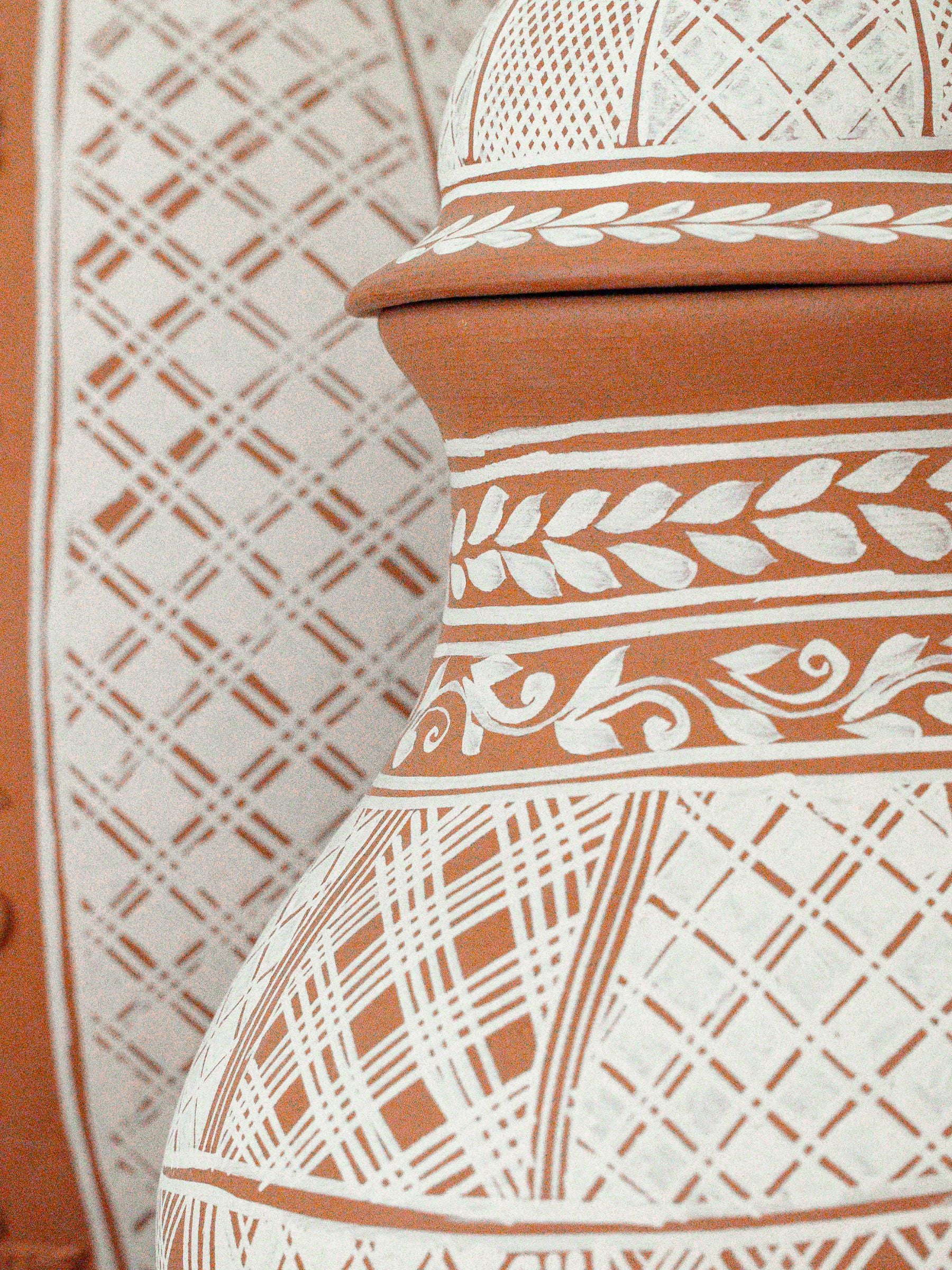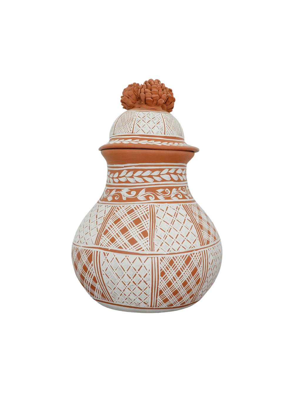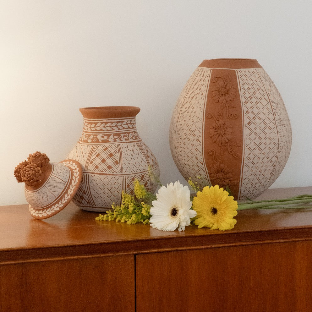 This exquisite lidded jar from Michoacán features a sculpted pinecone lid, a signature element of the region’s pottery. Hand-etched with traditional geometric patterns, this functional yet decorative piece reflects generations of craftsmanship. Perfect for display or storage, this jar adds an authentic touch of Mexican artistry to your home.