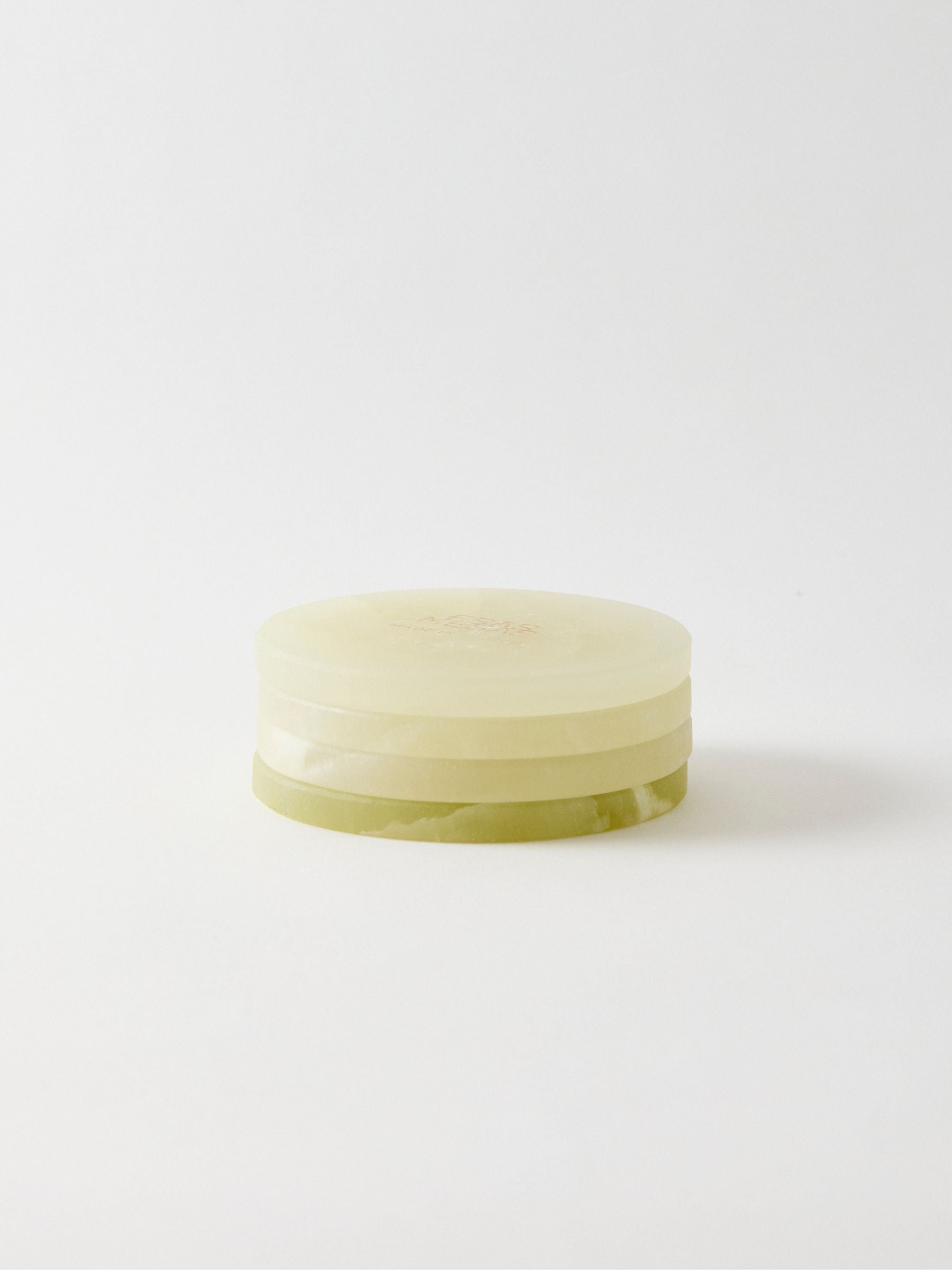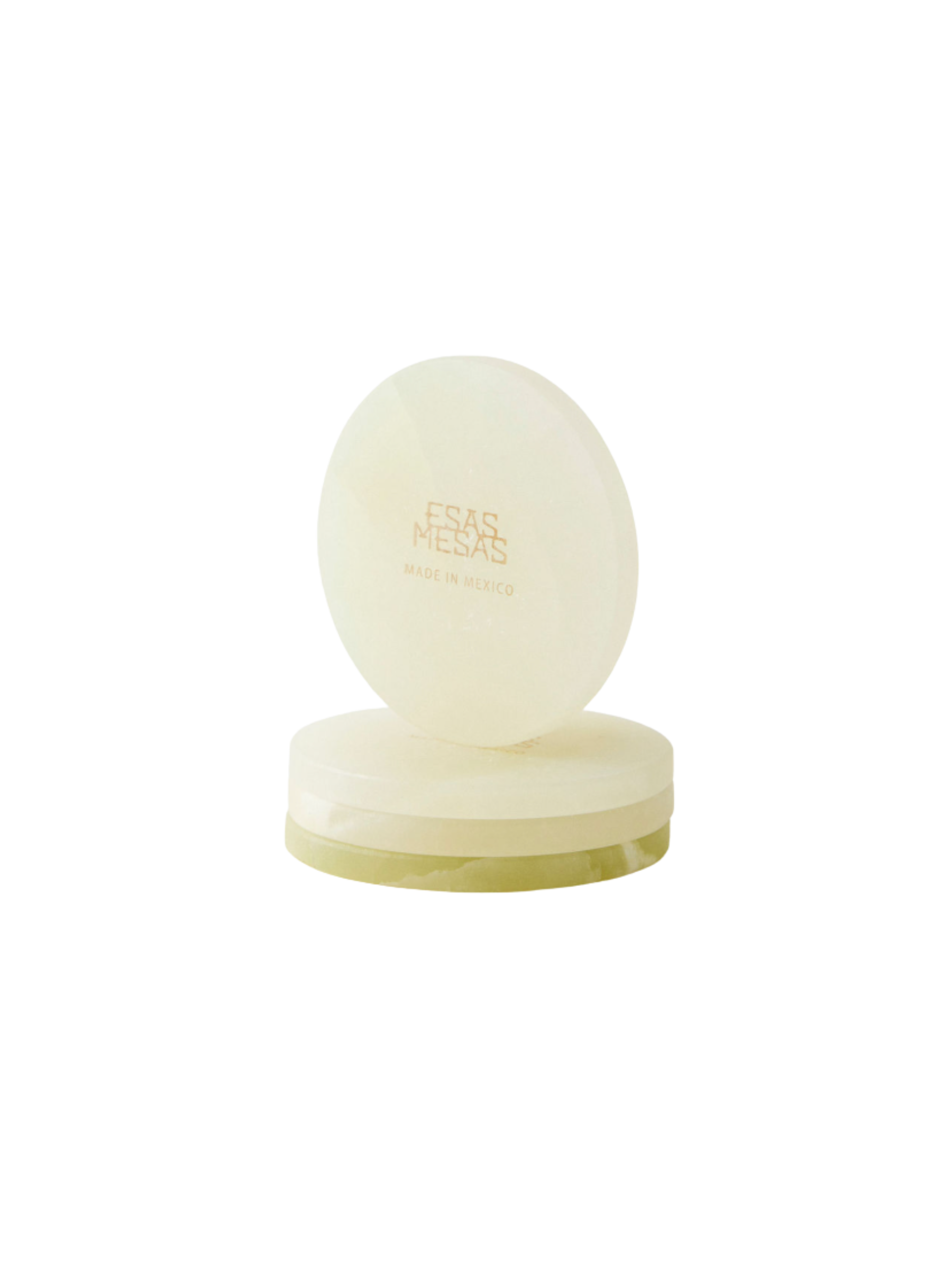 Carved from a single block of green onyx, these coasters are hand-finished in Mexico. Each set includes four round coasters with natural veining and subtle variation—no two alike.
