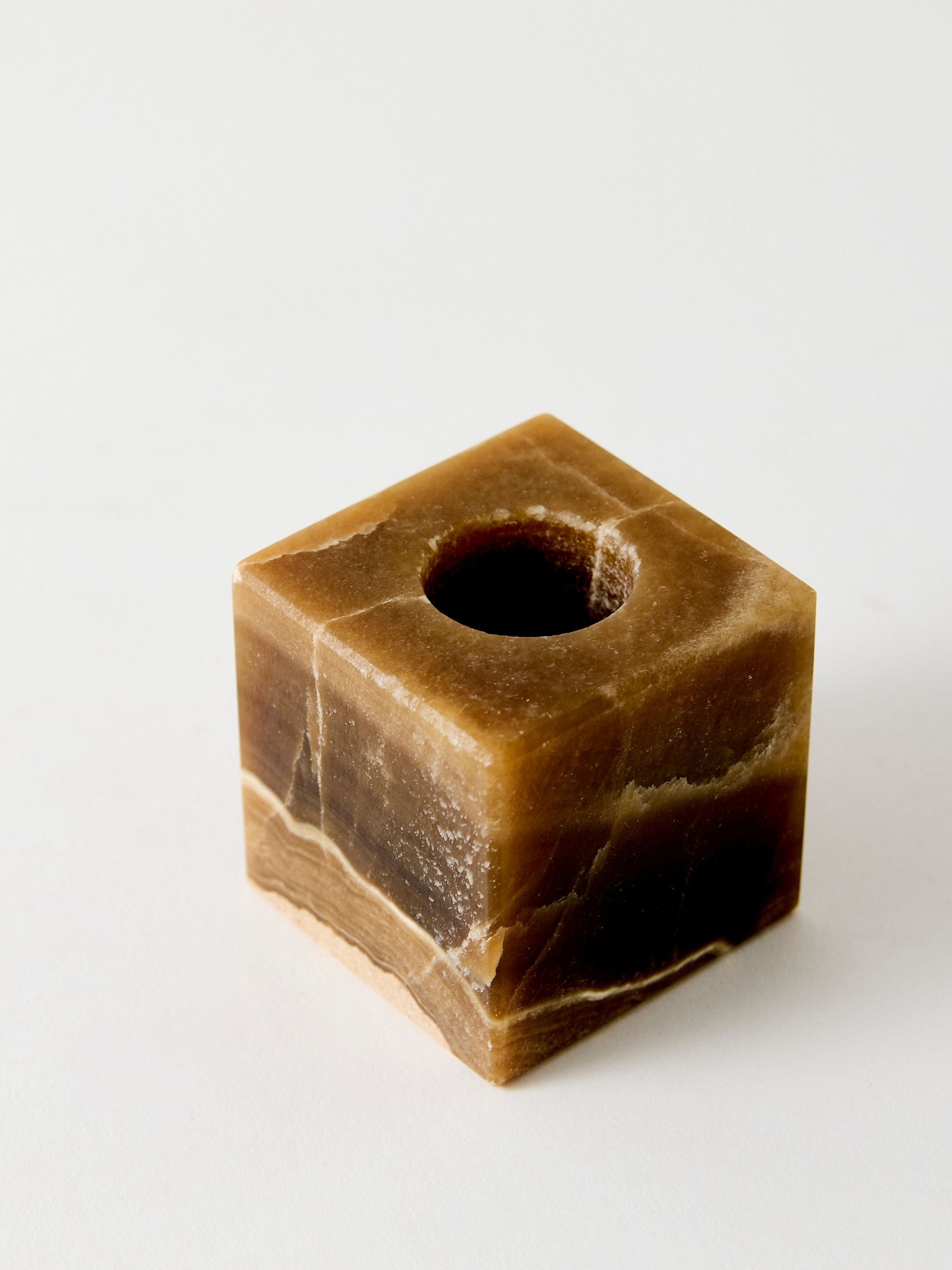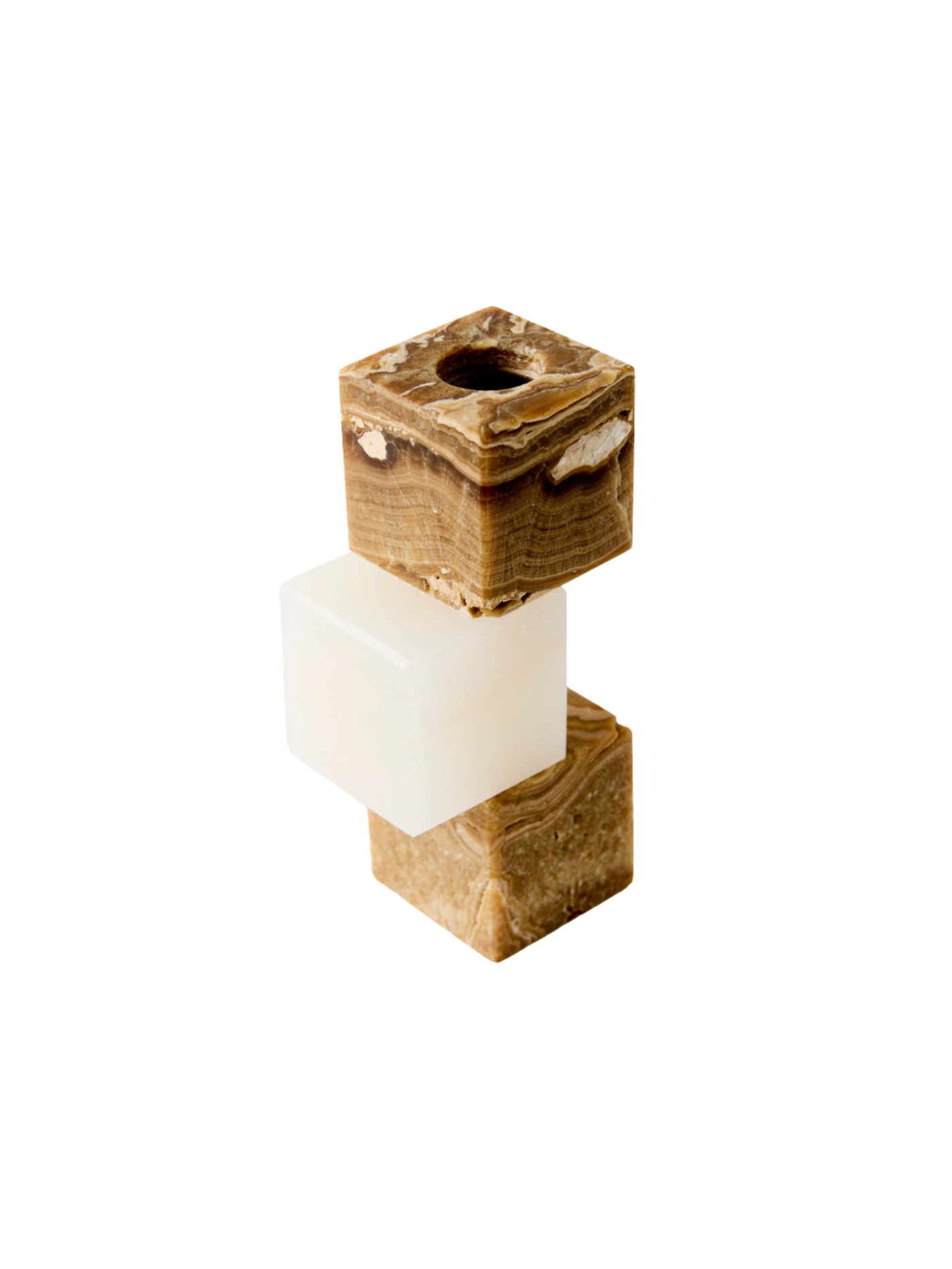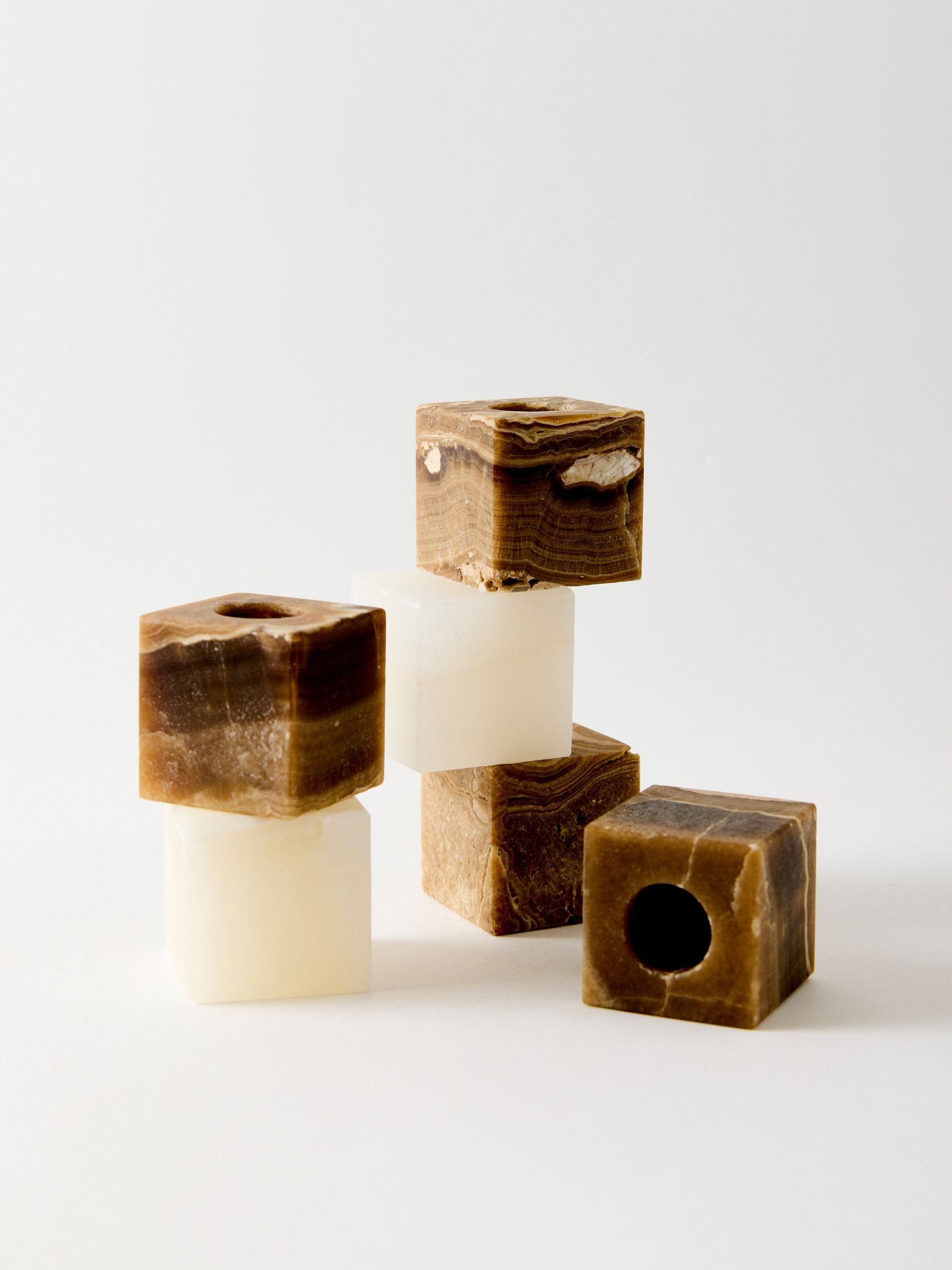 Carved from solid onyx, these three candleholders are stacked and shaped by hand to highlight the stone’s natural variations. The set includes three sizes.